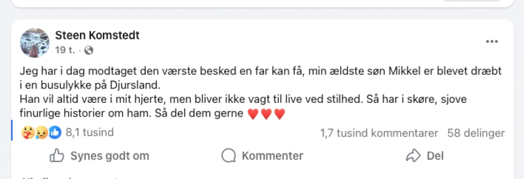 “Jeg har i dag modtaget den værste besked, en far kan få. Min ældste søn Mikkel er blevet dræbt i en busulykke på Djursland. Han vil altid være i mit hjerte, men bliver ikke vagt til live ved stilhed. Så har I skøre, sjove, finurlige historier om ham, så del dem gerne,” skrev han.