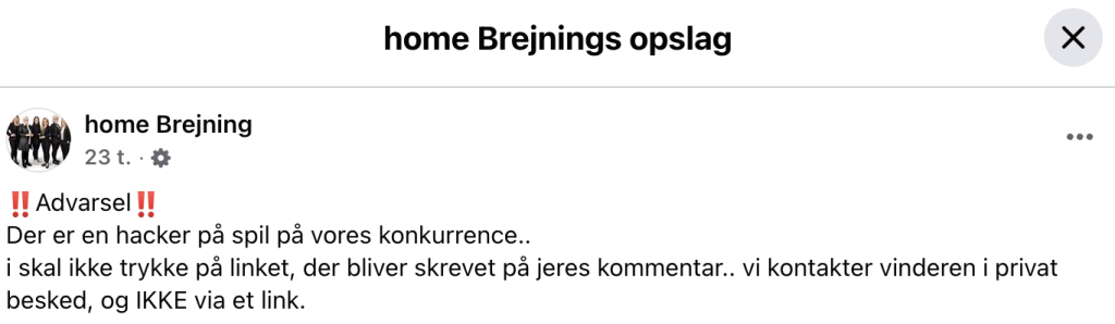 “Der er en hacker på spil på vores konkurrence… I skal ikke trykke på linket, der bliver skrevet på jeres kommentar.”
