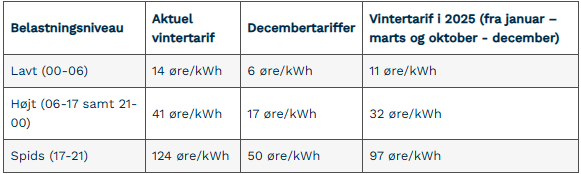 Det betyder for eksempel, at det i vinterperioden fremover koster 32,5 øre/kWh at bruge strøm midt på dagen, hvor det i dag koster 41,29 øre/kWh.