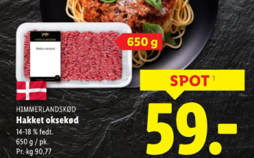 Skal det være ‘rent’ oksekød, så er det Lidl der ligger forrest igen. Her får du 650 gram hakket oksekød 14-18% til 59 kroner. Det giver en kilopris på 90.77 kroner.