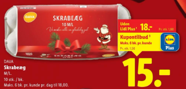 Når vi kigger på æggene er det igen Lidl der vinder. Du kan fra den 20. november til og med i morgen den 22. november få en bakke æg for 15 kroner. Bakken indeholder 10 æg, og dermed er prisen pr. stk 1.50 kroner .