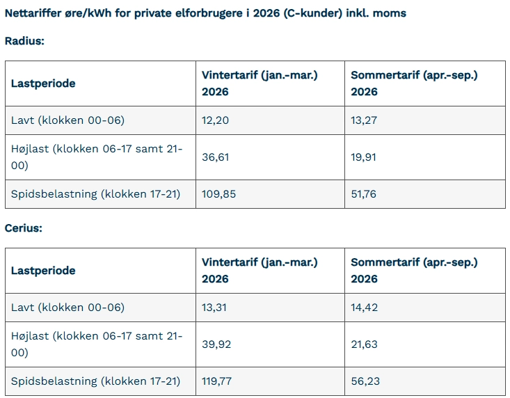 Cerius’ og Radius’ sommertariffer løber i perioden fra april til udgangen af september, hvorefter vintertarifferne igen træder i kraft.