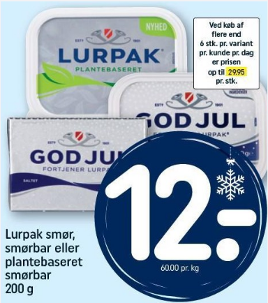 I Rema 1000 kan man således på Lurpak Smør, Lurpak Smørbar eller Lurpak Plantebaseret til 12 kroner per pakke.